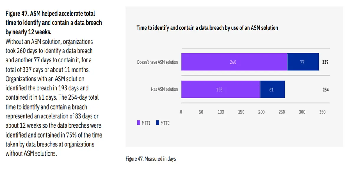 [ASM 솔루션을 보유하고 있는 조직은 그렇지 않은 조직에 비해 유출사고를 인지하고 대응하는데 25%의 시간이 절약된다]